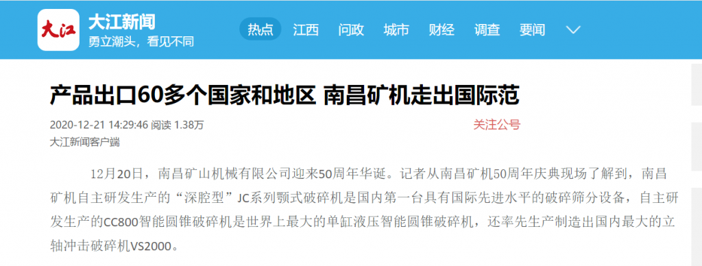 2020年12月20日,南昌矿山机械有限公司(以下简称“pg电子官方网站模拟器”)成立五十周年庆典暨pg电子官方网站模拟器2020年度总结表彰大会在南昌盛大举办,本次大会深受社会及行业广泛关注,接连被人民日报海外版、凤凰网、中国网、中国报道网、消费日报、机械工业网、江南热点、江西日报、江西网络广播电视台、江南都市报、大江网、手机江西台、腾讯新闻、百度新闻、网易新闻、一点资讯、今日头条等媒体竞相报道。